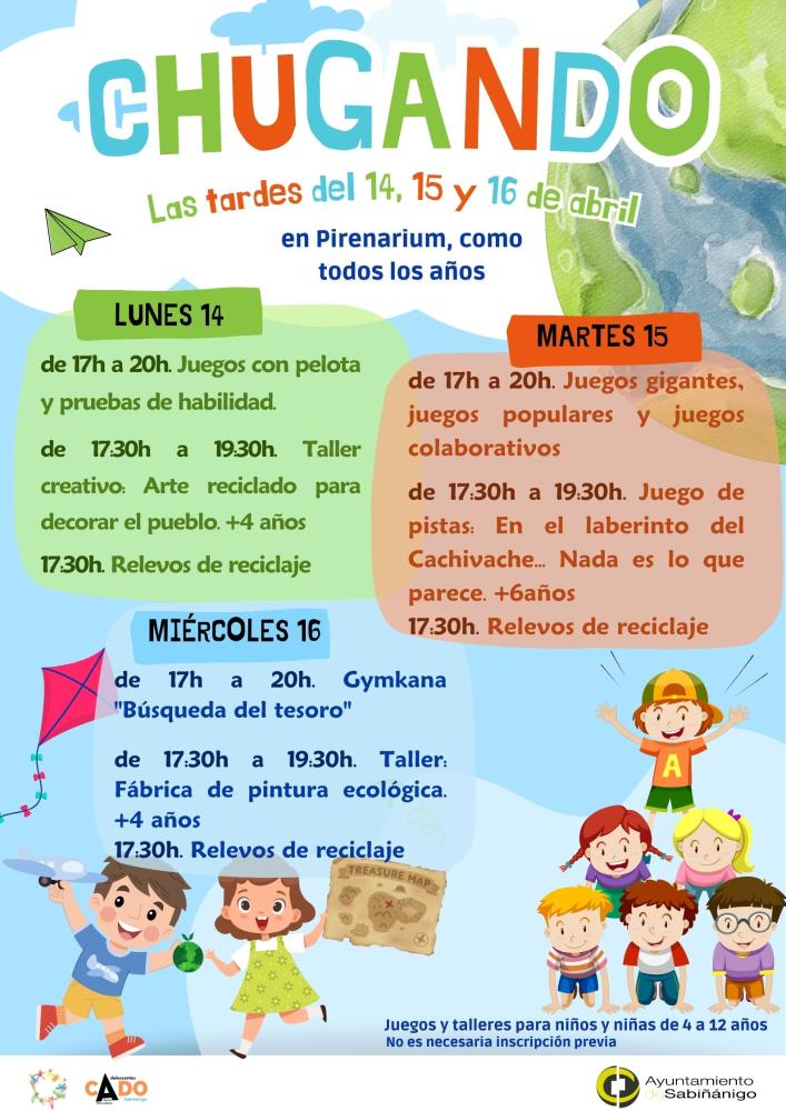 El espacio Pirenarium volverá a llenarse de diversión estas vacaciones con una nueva edición de Chugando, el programa infantil organizado por el Ayuntamiento de Sabiñánigo para los días 14, 15 y 16 de abril. Dirigido a niños y niñas de 4 a 12 años, el programa ofrecerá actividades gratuitas en horario de 17:00 a 20:00 horas.
