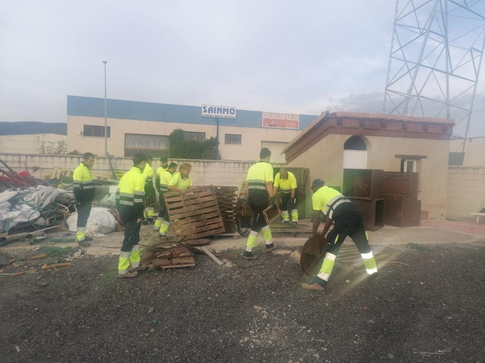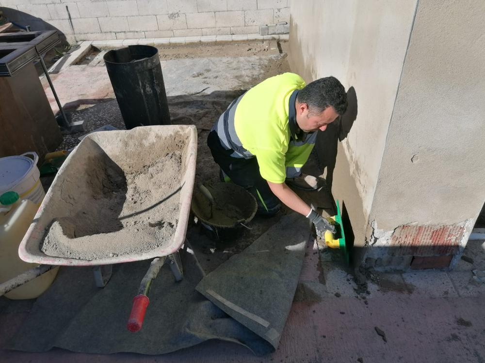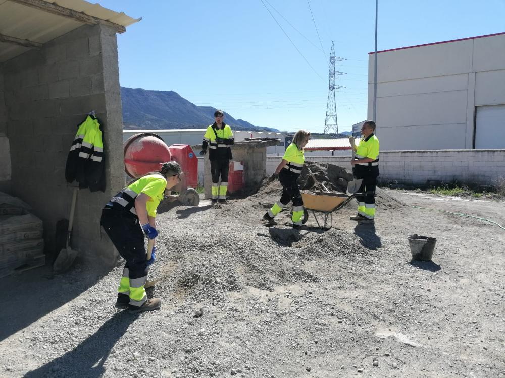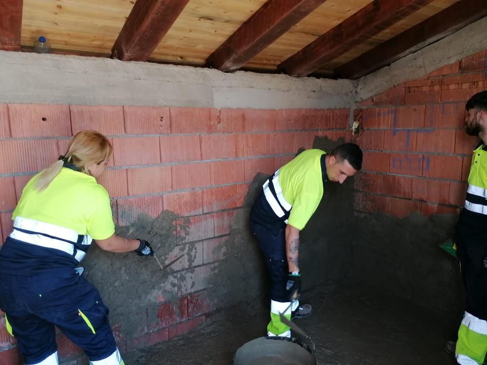 Para ello en el espacio libre del almacén municipal, hemos podido contar con la caseta que construyeron los componentes de un taller anterior, aprovechando que faltaban los revestimientos y aceras perimetrales. Una vez limpio y despejado el lugar, practicamos con la preparación de morteros para revestir paramentos verticales en el interior y exterior de la caseta y hormigón para finalizar las inacabadas aceras perimetrales. Y como siempre, al finalizar cada jornada, una tarea fundamental nos espera, la limpieza del lugar y de las herramientas utilizadas.