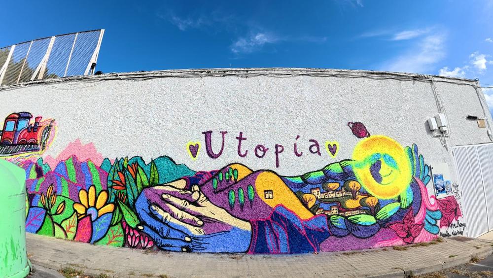 El Paseo de la Corona de Sabiñánigo se ha transformado con la inauguración del mural "Utopía", una vibrante composición artística que refleja la visión esperanzadora de futuro de los jóvenes de la localidad. Este proyecto no solo embellece el espacio público, sino que es un ejercicio de reflexión cívica y colaboración comunitaria, gestado a partir de las ideas del alumnado de segundo de ESO del IES San Alberto Magno.