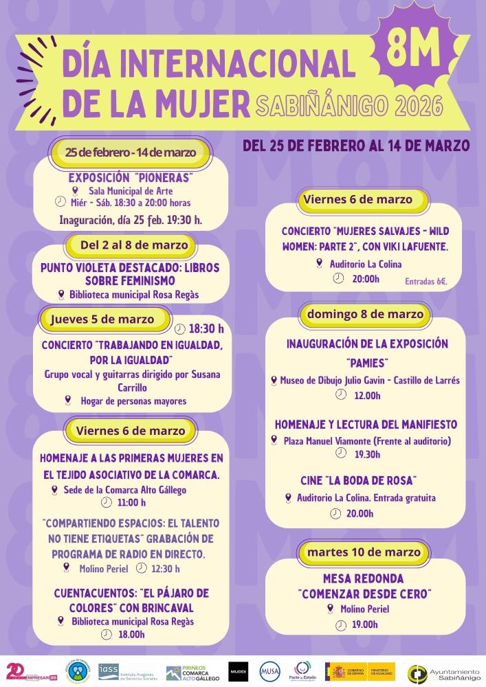 El Ayuntamiento de Sabiñánigo ha presentado esta mañana el programa de actos con motivo del 8 de marzo, Día Internacional de la Mujer. Bajo el lema internacional "Derechos, Justicia, Acción para todas las mujeres y niñas", la capital del Alto Gállego reafirma su compromiso con la igualdad real a través de una agenda que combina cultura, reflexión, historia y reconocimiento al talento local.