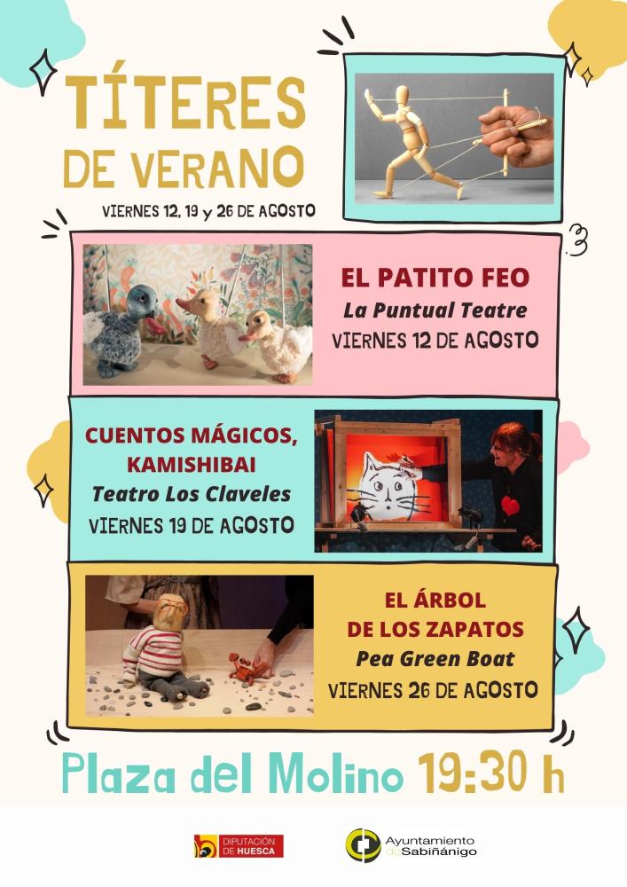 En cuanto a “Títeres de verano”, decir que está conformado por tres representaciones de teatro de títeres, especialmente dirigidas a público infantil. Este programa, coorganizado con la Casa de los Títeres de Abizanda, se llevará a cabo todos los viernes de agosto en la Plaza El Molino, a las 19,30 horas y contará con la presencia de las compañías La Puntual, Los Claveles y Pea Green Boat.