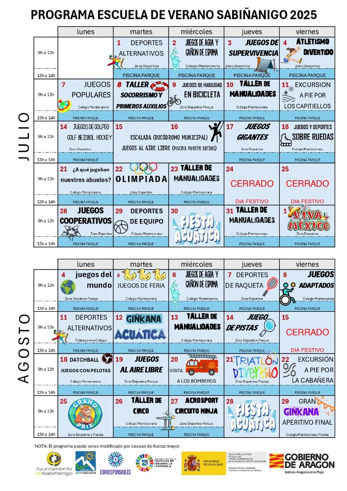 El Ayuntamiento de Sabiñánigo ofrece un servicio de Escuela de Verano en el marco del Plan Corresponsables de Ministerio de Igualdad y en colaboración con la Comarca del Alto Gállego. Se ofrece un programa de actividades variadas y ajustadas a las diferentes edades: talleres, juegos y deportes, días de piscina con actividades acuáticas. Excursiones por el entorno, etc. La programación se publicará próximamente.