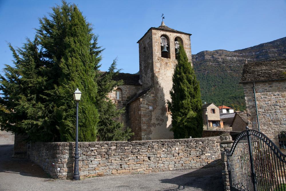 La Iglesia parroquial se encuentra incluida dentro del grupo serrablés. Fechada en el siglo XI nos ofrece las tipologías de estos templetes, nave única y ábside semicircular decorado al exterior con una arquería de la que se prolongan una serie de baquetones junto al tejaroz. La torre que se levanta a los pies data de época moderna y todavía conserva algunos elementos decorativos como un crismón y restos de la imposta de ajedrezado jaqués. Junto al edificio una gran piedra presenta varias figuraciones incisas, sobretodo aves y motivos geométricos.