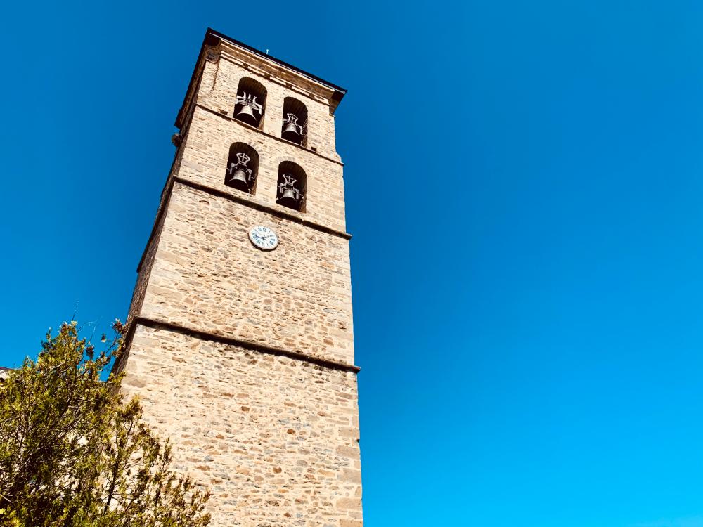 El perfil de la torre destaca con una cronología anterior al siglo XVI, cuenta con cuatro cuerpos abriéndose los dos últimos con parejas de vanos en forma de arco de medio punto donde se albergan las campanas.